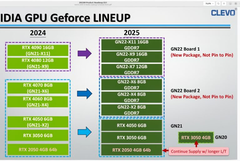 NVIDIA prévoit jusqu’à six déclinaisons de la série GeForce RTX 5000 pour laptops. La nouvelle génération, nom de code GN22, apparaît comme un produit de 2025 dans des roadmaps Clevo divulguées. Cette société aurait été la cible d’un groupe de pirates informatiques, qui a maintenant rendu les documents publics.