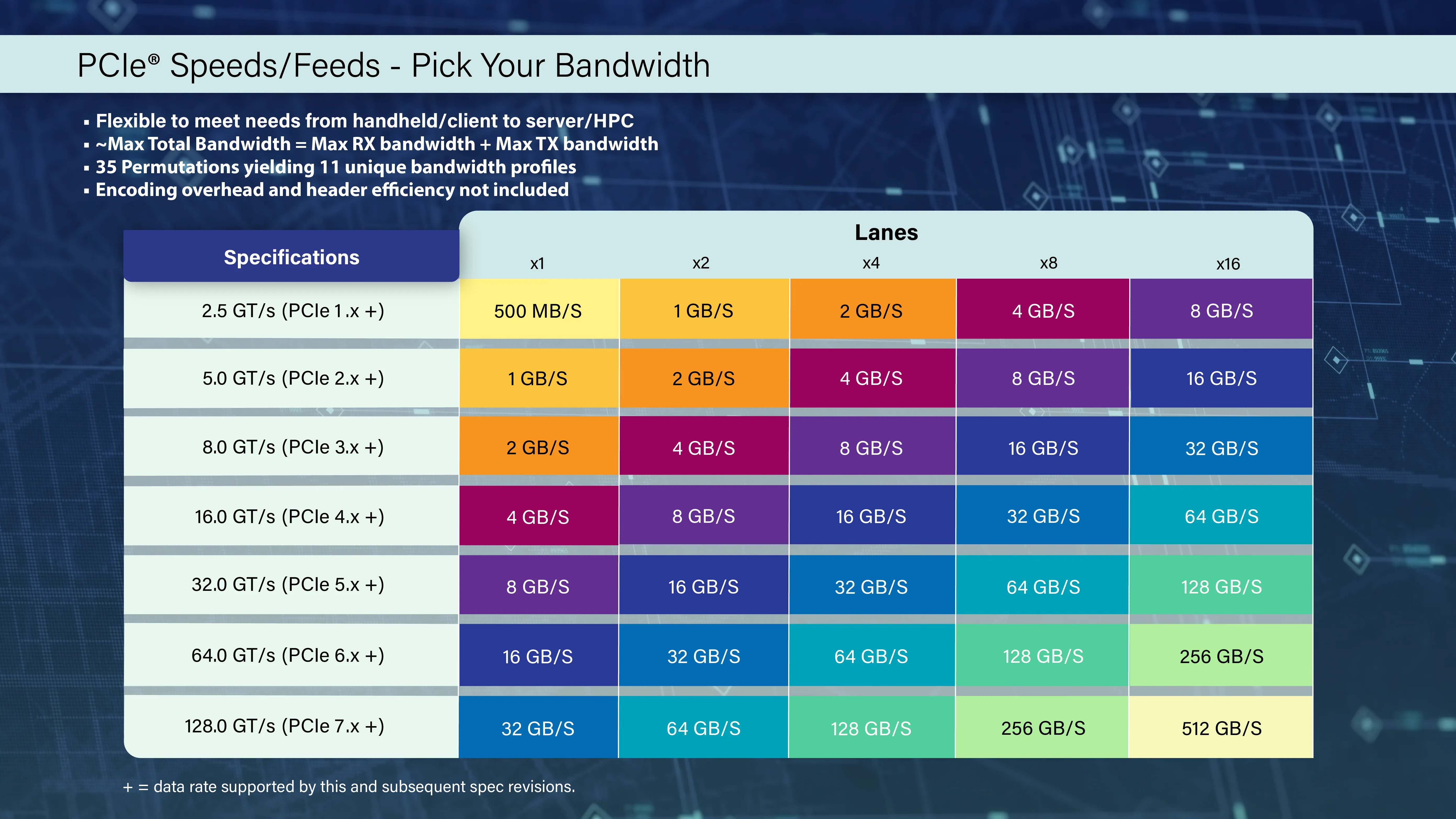 PCIe 7.0 est la prochaine technologie d’interconnexion de nouvelle génération pour les ordinateurs qui devrait augmenter les vitesses de transfert de données à 128 GT/s par broche, soit le double des 64 GT/s de PCIe 6.0 et le quadruple des 32 GT/s de PCIe 5.0. Cela permettrait à une connexion de 16 voies (x16) de prendre en charge 256 Go/s de bande passante dans chaque direction simultanément, en excluant les frais généraux d’encodage. De telles vitesses seront utiles pour les futurs centres de données ainsi que pour l’intelligence artificielle et les applications de calcul haute performance qui auront besoin de taux de transfert de données encore plus rapides, y compris les taux de transfert de données réseau.