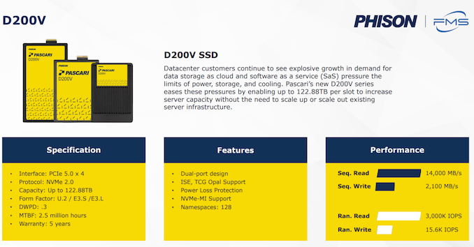 Le D200V Gen 5 a pris la tête des disques exposés, grâce à sa capacité exceptionnelle de 61,44 To (un disque de 122,88 To est également prévu dans la même gamme). L’utilisation de la QLC dans cette gamme axée sur la capacité réduit les vitesses d’écriture séquentielles soutenues à 2,1 Go/s, mais celles-ci sont conçues pour des charges de travail axées sur la lecture.