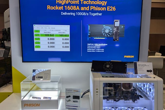 Bien que ce ne soit pas strictement une démonstration d’entreprise, Phison a proposé une station montrant des lectures et écritures séquentielles dépassant 100 Go/s avec une station de travail classique. Le secret était l’installation de deux cartes d’extension HighPoint Rocket 1608A (chacune avec huit emplacements M.2) et la mise en RAID 0 des 16 disques M.2.