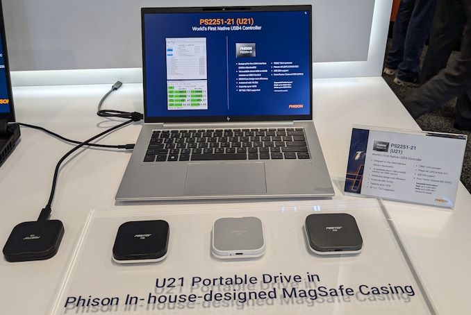 La société a également montré un design de référence PSSD USB4 U21 (avec un boîtier compatible MagSafe), ainsi que les résultats habituels des benchmarks CrystalDiskMark. Il a été indiqué que les PSSDs basés sur le contrôleur U21 sont très proches d’une disponibilité en retail.