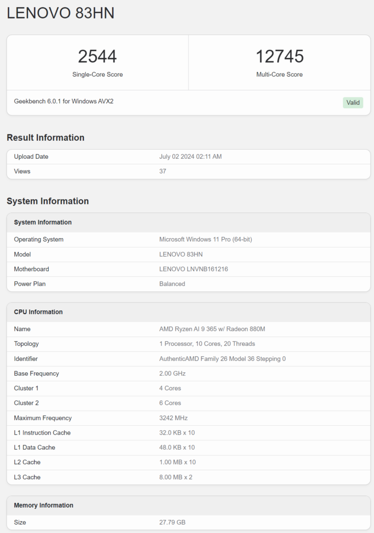 Lenovo travaille sur un ordinateur portable équipé par le Ryzen AI 9 365. Ce système a été repéré lors de tests Geekbench. Le processeur Ryzen AI 9 365 est un variant de Strix Point avec 4 cœurs Zen5 et 6 cœurs Zen5c, atteignant jusqu’à 5.0 GHz. Les résultats du benchmark montrent des scores de 2544 points en single-core et 12,745 points en multi-core. Il est prévu que les ordinateurs portables équipés du Ryzen AI 9 365 arrivent sur le marché fin juillet.