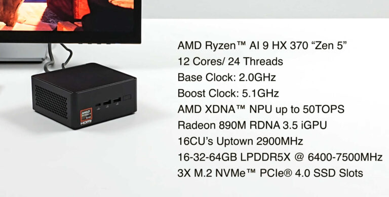 La Société a maintenant confirmé qu’il y aura deux déclinaisons de ce Mini-PC, équipées soit du Ryzen AI 9 HX 370 (le modèle haut de gamme avec le silicium complet) soit du Ryzen AI 9 365 avec 10 cœurs CPU et 12 unités de calcul graphique.