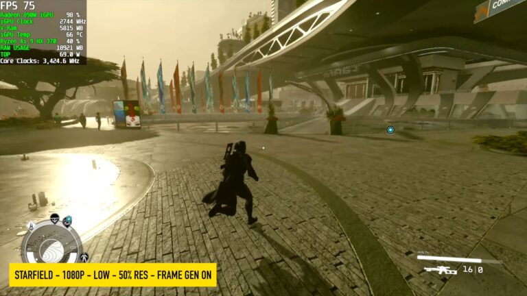 - Starfield 1080p, Bas, échelle de résol. 50%, Génération d’images : 78 FPS (Moyenne)
