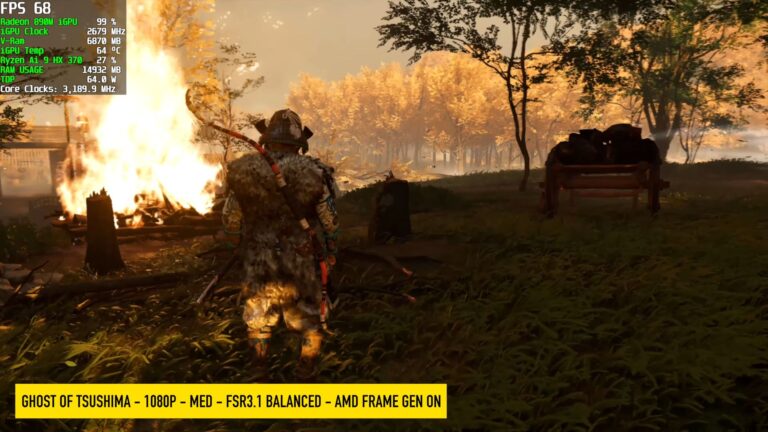 - Ghost of Tsushima 1080p, Moyen, FSR 3.1 équilibré, Génération d’images: 62-73 FPS