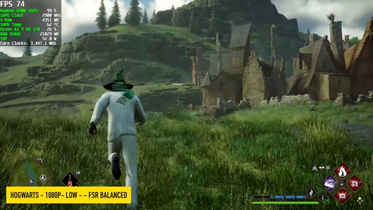 - Hogwarts 1080p, Bas, FSR équilibré: 72 FPS (Moyenne)
