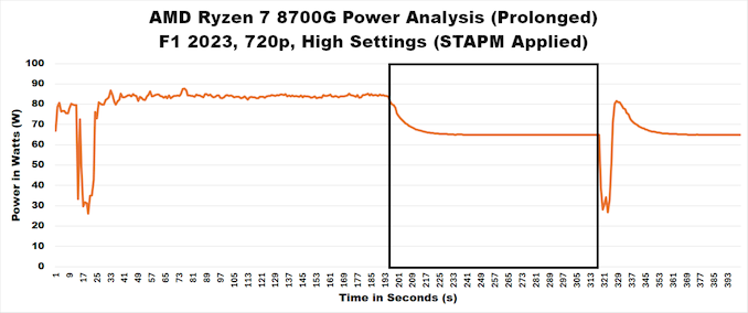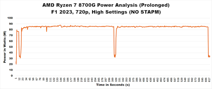 En rejouant le même jeu (F1 2023) avec les mêmes paramètres (720p High) et en utilisant le firmware qui indiquait que le STAPM avait été supprimé, nous pouvons constater que nous n’observons aucune limitation de la puissance comme nous l’avions initialement constaté. Nous pouvons voir que la puissance est maintenue pendant plus de 10 minutes de test (ça a été testé deux fois plus longtemps), et nous n’avons constaté aucune baisse de la puissance du processeur, du moins pas liée au STAPM. Cela indique que pour les utilisateurs du dernier firmware sur n’importe quelle carte mère AM5 utilisée, la puissance et, en fin de compte, les performances restent constantes par rapport à ce que le Ryzen 7 8700G aurait dû obtenir au lancement.
