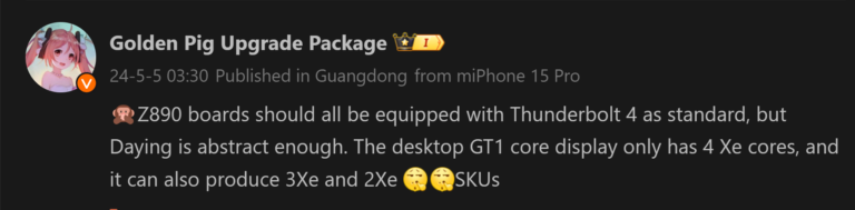 Le leaker Golden Pig Upgrade (金猪升级包) affirme que les prochaines cartes mères Z890 seront équipées de la connexion Thunderbolt 4 en standard. Il s’agit d’un détail surprenant étant donné qu’Intel a annoncé Thunderbolt 5 en septembre de l’année dernière.