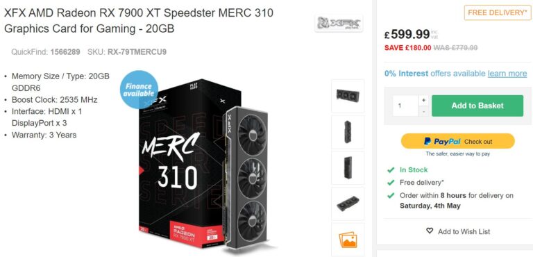 De plus, le modèle XFX RX 7900 XT, que ils ont récemment mentionné comme étant proposé à un prix historiquement bas de £629.99, a été encore réduit à £599.99. C’est également la première fois que le Navi 31 XT à prix réduit est disponible à ce prix au Royaume-Uni.