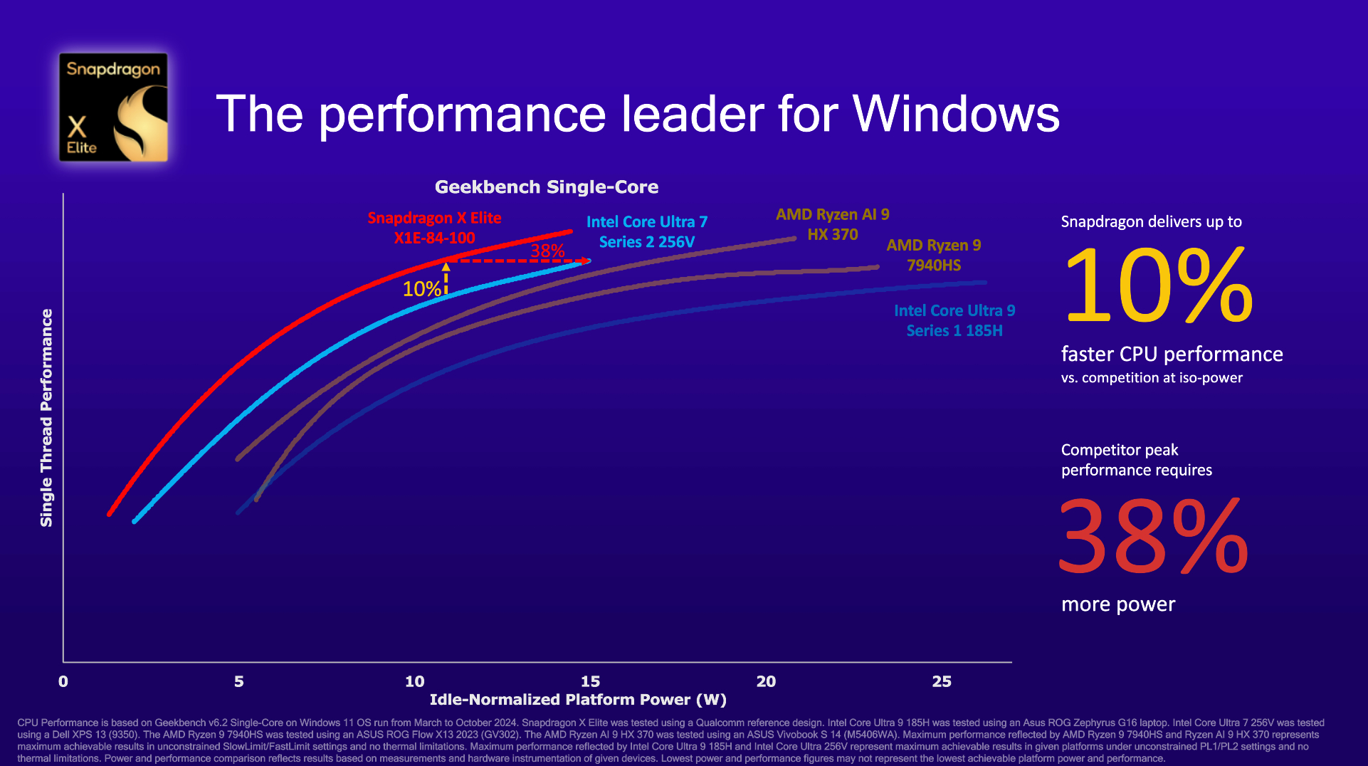 L’argument principal est que la puce de Qualcomm offre toujours une meilleure efficacité énergétique. En particulier, Qualcomm souligne que les puces Lunar Lake consomment 38 % d’énergie en plus en performance maximale.