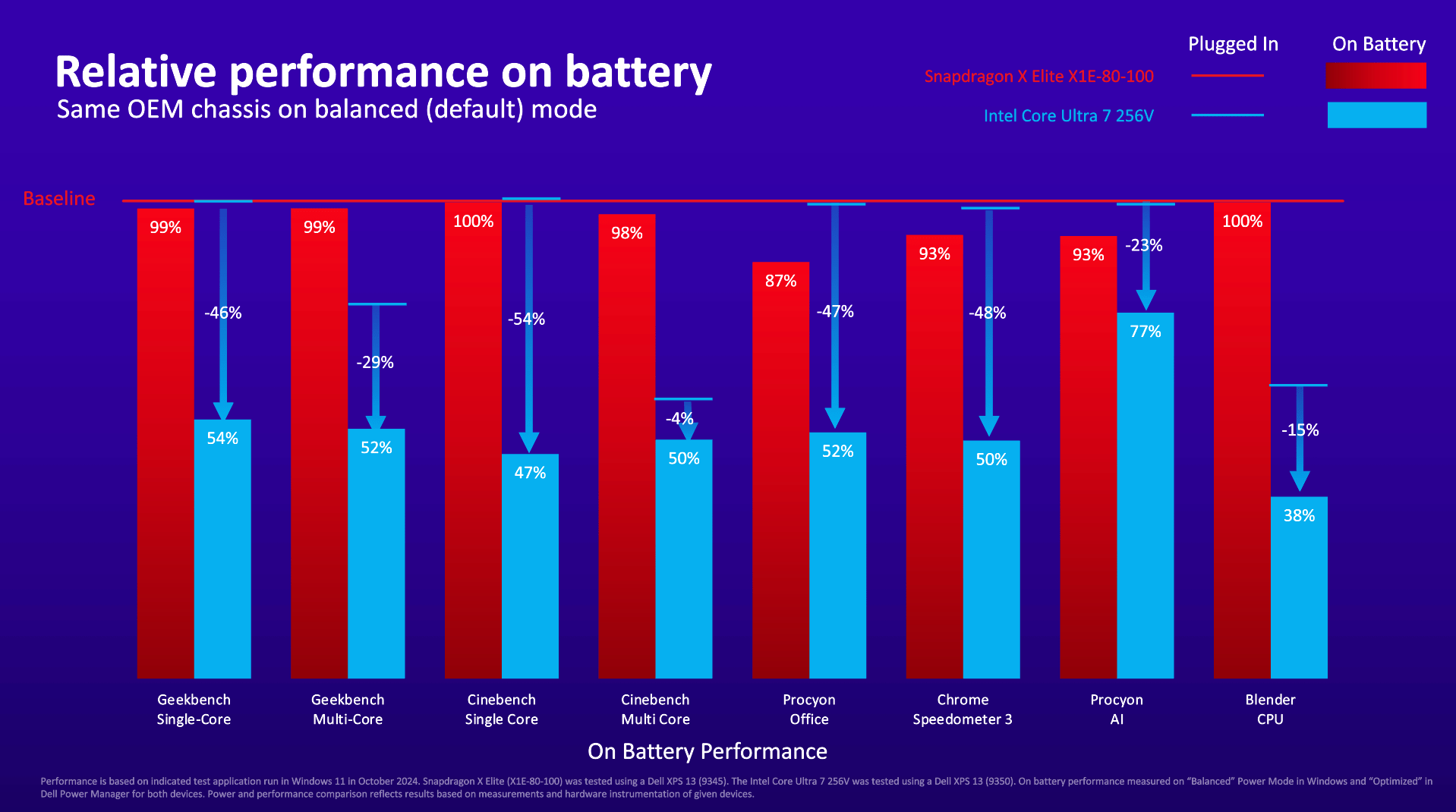 Qualcomm ne conteste pas les affirmations ambitieuses d’Intel, mais souligne qu’Intel ne révèle pas toute l’histoire. Comme nous l’avons appris lors de les tests, les puces Core Ultra Series 2 ne maintiennent pas de bonnes performances sur batterie, ce qui est un atout des puces Arm, y compris les Snapdragon X Elite et Apple Silicon. Qualcomm démontre que, dans l’ensemble, les dernières puces d’Intel subissent une chute significative de performance sur batterie, parfois jusqu’à 54 % dans certains tests.