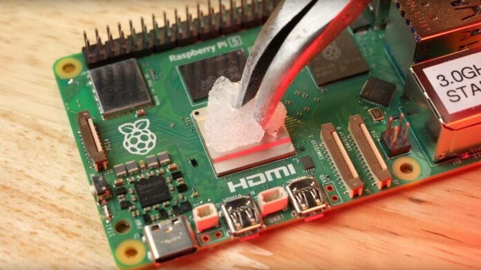 Comme on peut s’y attendre, les tensions élevées entraînent des températures plus élevées, atteignant près de 70°C tout en tirant environ 20W du secteur. Bien que cela soit courant pour des PC classiques, c’est considérable pour les Raspberry Pi qui commencent à throttler thermiquement vers 85°C. Pour maîtriser les températures, Jeff a opté pour un refroidisseur thermoelectrique Peltier qui utilise l’électricité pour déplacer la chaleur d’un côté touchant la puce à l’autre en contact avec le dissipateur.