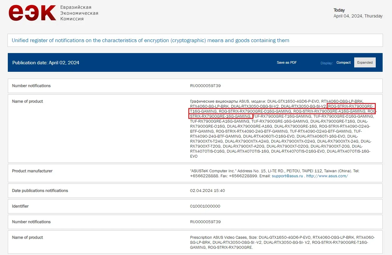 (ASUS ROG Strix Radeon RX 7900 GRE est la liste EEC)