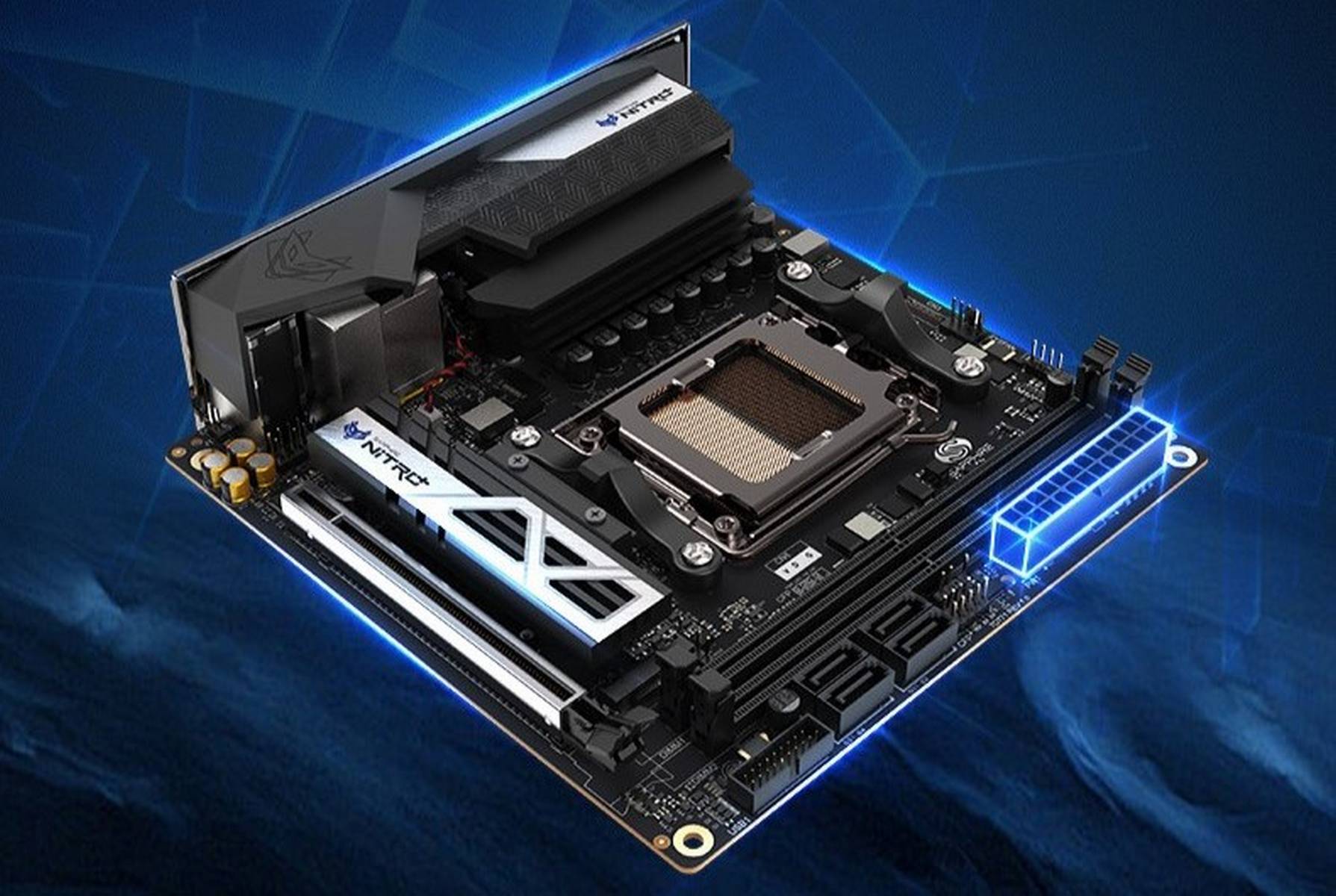 Le Nitro+ B650I, avec son format Mini-ITX de 170x170mm, est encore plus compact. Cette carte présente des phases d’alimentation 8+2+2 à 80A, un slot PCIe Gen 4 pour carte graphique, ainsi que deux slots DIMM supportant la mémoire DDR5 jusqu’à 6000 MHz.