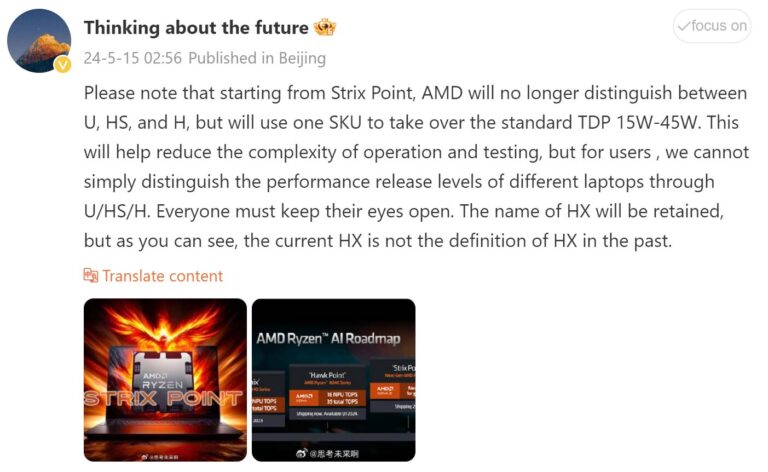 Jusqu’à présent, nous n’avons pas vu de confirmation de ce changement, mais des fuites ont déjà mentionné le SKU Ryzen AI HX 170 et les modèles apparents Ryzen AI 165. Le fait qu’AMD prévoie une seule marque pour l’ensemble de sa série Strix Point suggère que de tels processeurs seront lancés avec un TDP configurable dans la plage de 15 à 54W. La gamme actuellement connue pourrait ressembler à ceci: