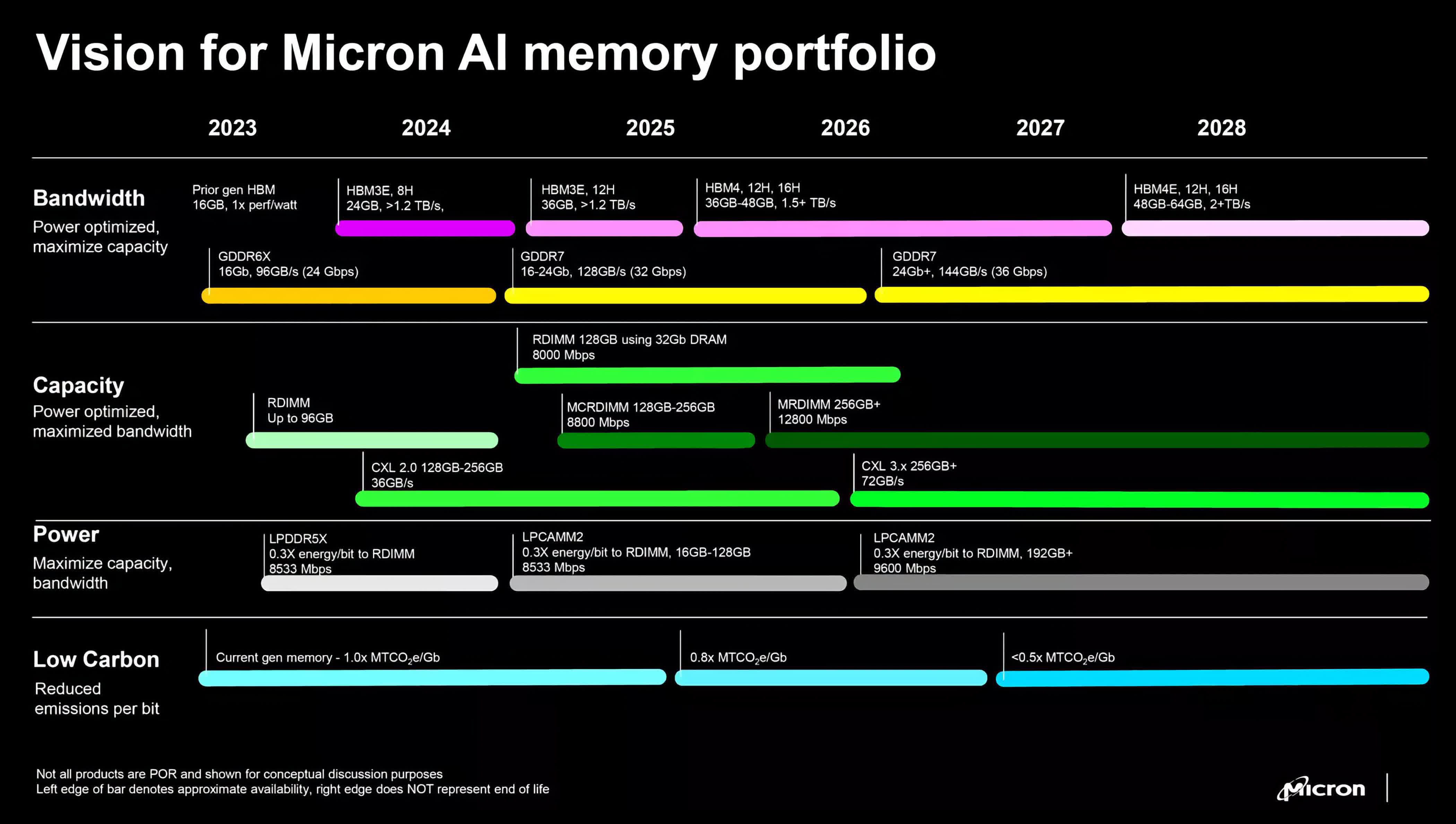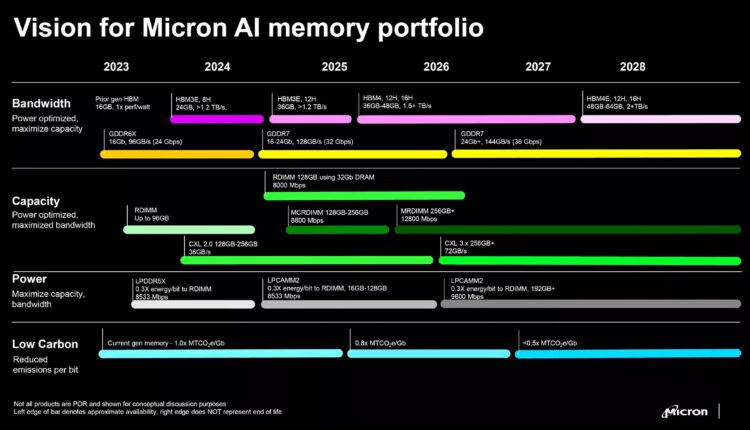 Les plans pour les modules de 3 Go (étiquetés comme 24Gb) sont apparus pour la première fois sur une roadmap de Micron de 2023. Leur lancement est prévu pour cette année. Samsung a également présenté des modules de 3 Go à la fin de l’année dernière, mais cela a sans doute été trop tard pour être inclus dans la première gamme de RTX 5000 de NVIDIA.