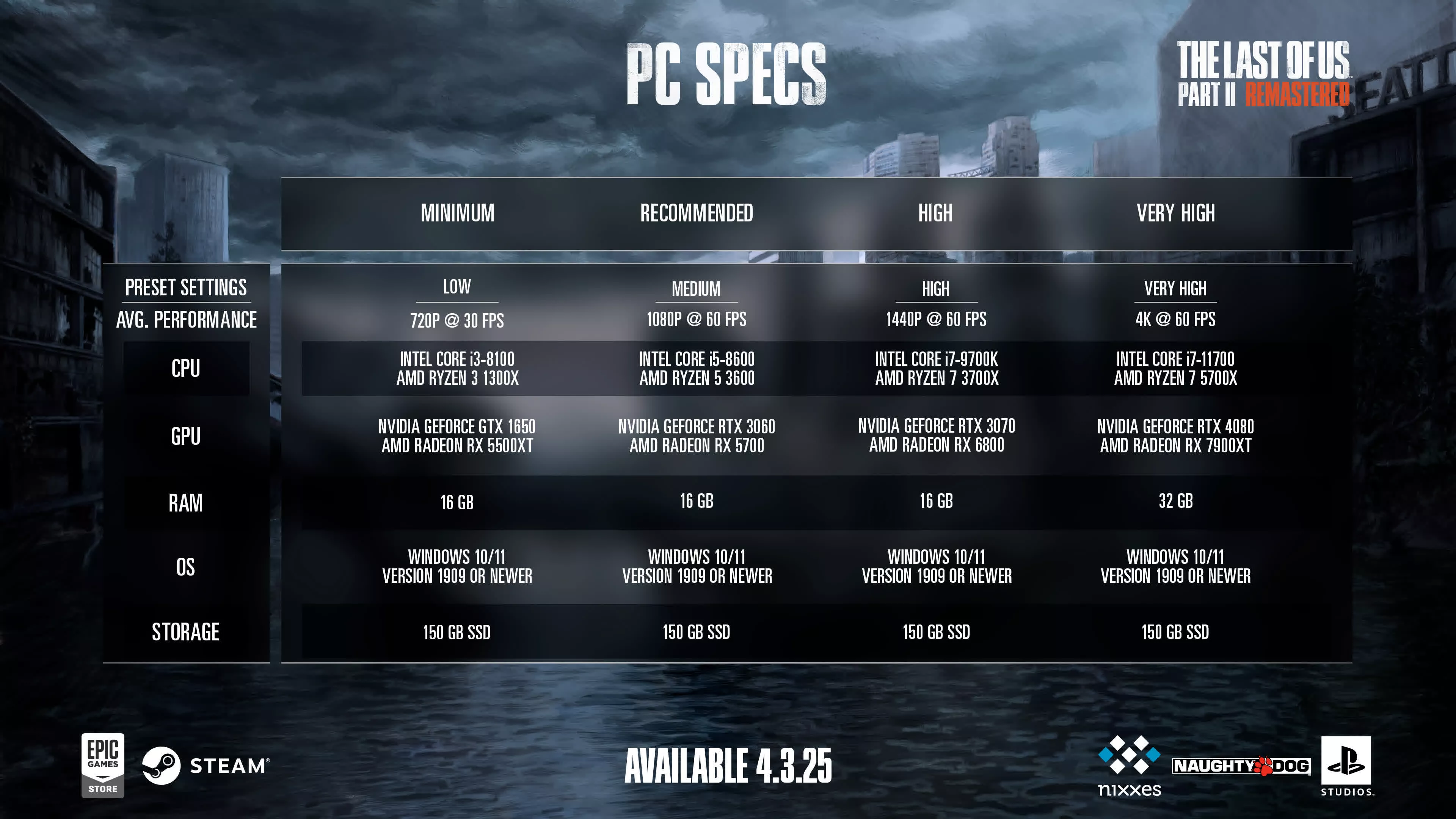 Les exigences système pour The Last of Us Part II ressemblent fortement à celles de la conversion PC du premier jeu (et, de manière étonnante, à celles de Spider-Man 2, à l’exception des caractéristiques de ray tracing). Néanmoins, le besoin de stockage pour la suite a considérablement augmenté, passant de 100 Go à 150 Go, probablement en raison de son mode histoire beaucoup plus long.