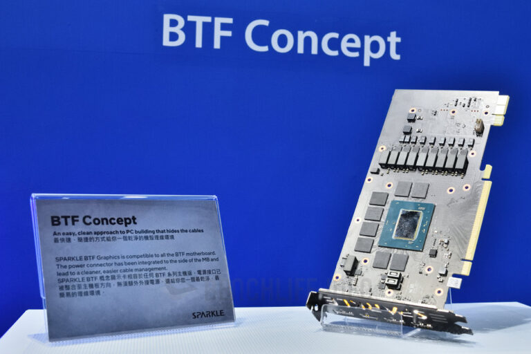 À Computex, Sparkle a présenté trois GPU intéressants basés sur Arc. L’un de ces GPU était doté d’un design BTF, apparemment inspiré de la série « Back to The Future » d’ASUS avec des connecteurs d’alimentation cachés. ASUS a développé une carte mère et un design de GPU qui, au lieu d’utiliser des connecteurs d’alimentation standard, utilisent un slot PCI supplémentaire dédié uniquement à la fourniture d’alimentation. À en juger par l’image, le connecteur semble identique, indiquant une collaboration entre les sociétés.