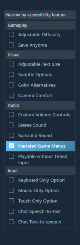 Les nouveaux filtres incluent des caractéristiques devenues courantes dans les jeux modernes, telles que la taille de texte personnalisable, les modes pour daltoniens, l’audio descriptif et la synthèse vocale (et vice versa). Les utilisateurs peuvent également filtrer les jeux selon qu’ils sont jouables uniquement avec le clavier, uniquement avec la souris ou incluent des pressions sur boutons chronométrées obligatoires. Valve a également ajouté des filtres pour le son stéréo, le son surround, la difficulté ajustable et la possibilité de sauvegarder à tout moment.