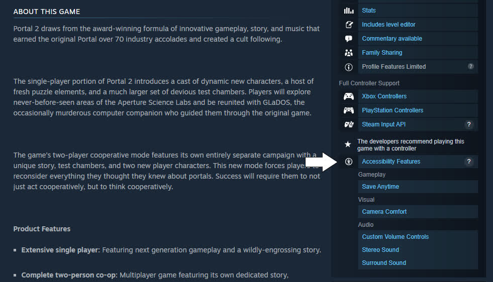 De plus, les jeux comprenant des fonctionnalités d’accessibilité les affichent désormais dans un menu déroulant sur le côté droit de la page de la boutique, sous la section de support des contrôleurs. Valve a indiqué que les informations sur l’accessibilité sont visibles sur plus de 5,000 pages de la boutique.
