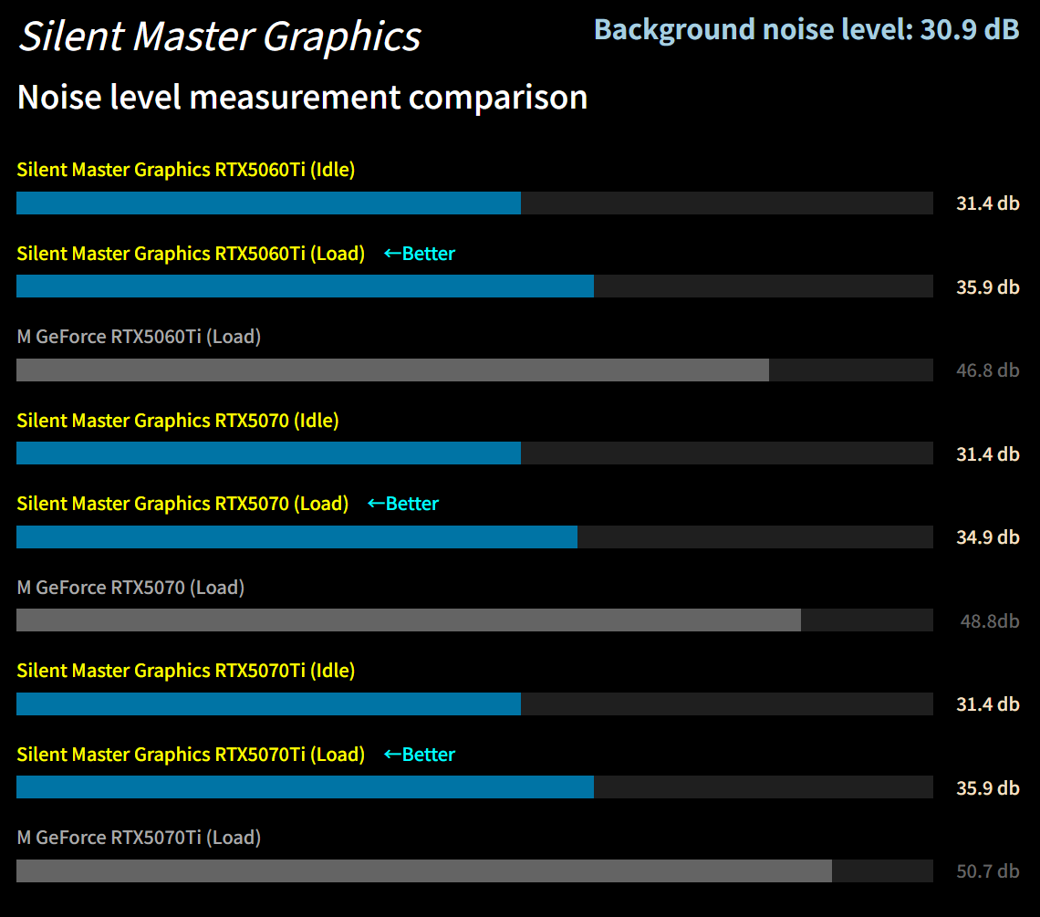 Les tests internes de Sycom montrent que les cartes de la série Silent Master émettent entre 34,9 et 35,9 décibels sous charge, et 31,4 décibels au repos. En comparaison, d’autres cartes graphiques génèrent environ 46 à 47 dB(A) en pleine charge.