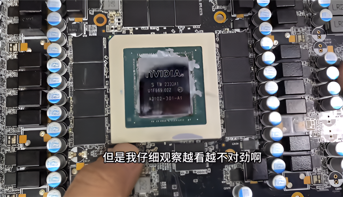 Dans l’un des cas, un acheteur a acquis une RTX 4090 pour 3 800 yuans (environ 520 €). Ce qui semblait être un bon rapport qualité-prix s’est rapidement transformé en désillusion. Lors d’une inspection, le GPU paraissait légitime, avec tous les étiquettes de garantie en place. Toutefois, une fois ouvert, il s’est avéré que la puce était beaucoup plus petite que la norme.