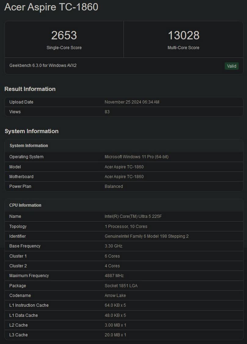 La liste, repérée par l’utilisateur X Benchleaks, montre que le Core Ultra 5 225F dispose de 10 cœurs, dont six cœurs de performance et quatre cœurs efficaces. Les caractéristiques supplémentaires incluent 20 Mo de cache L3 et une fréquence maximale de 4,887 GHz. Il est à noter que cette vitesse de fréquence reflète le pic du processeur lors du test Geekbench et ne représente peut-être pas les caractéristiques officielles en vente.