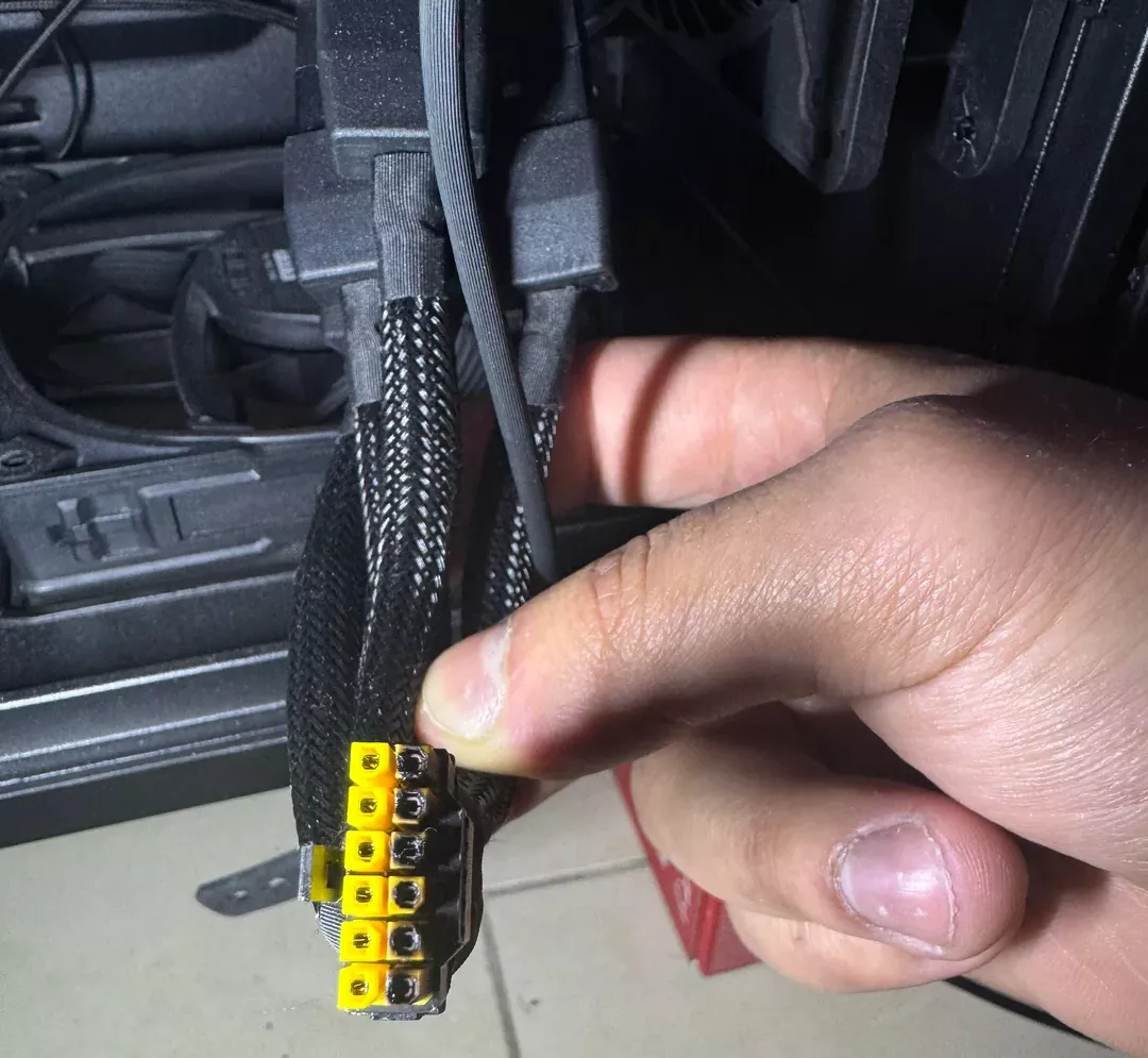 Un détail intéressant à noter est que le câble utilisé faisait partie des modèles à embouts jaunes de MSI. Cette marque a été parmi les premières à expédier des câbles d’alimentation PSU/carte graphique 12V-2×6 avec un boîtier en plastique de couleur vive. L’idée derrière cette conception est d’obliger les utilisateurs à enfoncer suffisamment les connecteurs pour que la couleur ne soit plus visible, garantissant ainsi un bon contact et réduisant les risques de surchauffe.