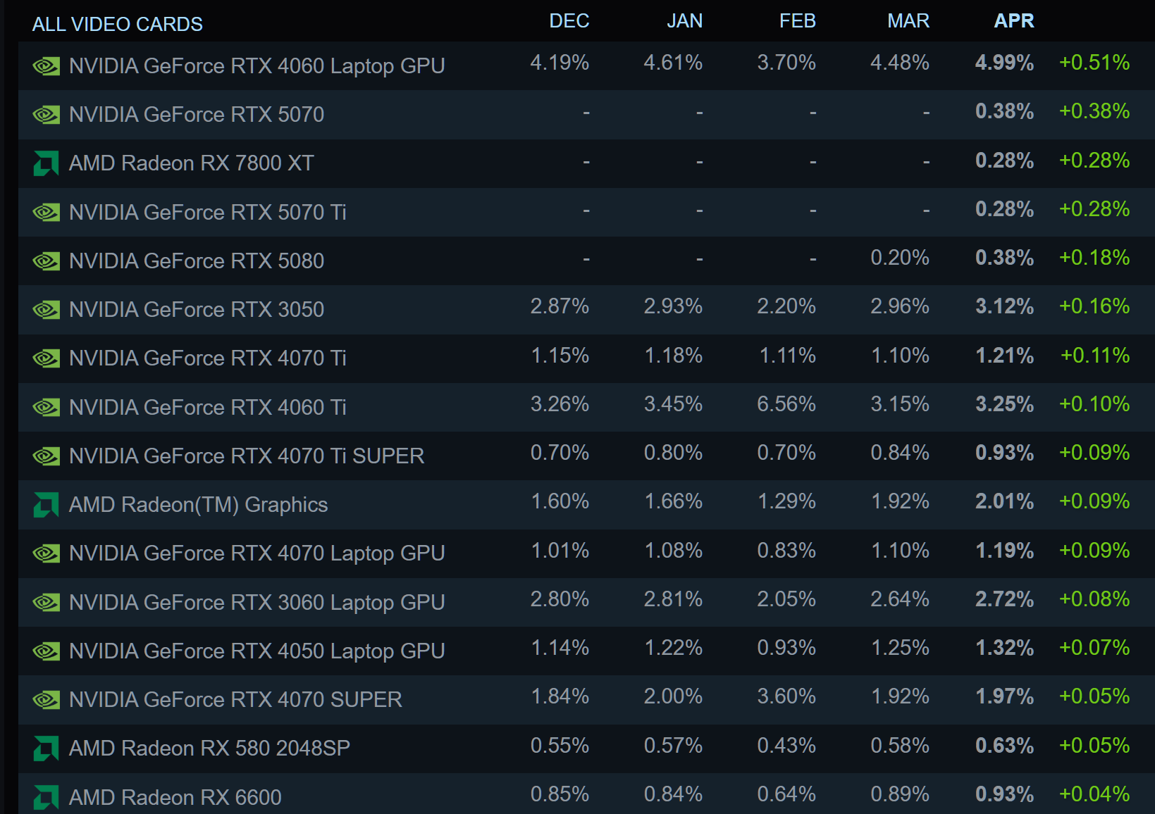 Un autre mois et un nouveau GPU en tête des résultats de l’enquête de Valve sur Steam. Pour la première fois en plus de trois ans, le produit le plus populaire parmi les participants est un GPU de PC portables, remplaçant le RTX 3060 en tant que leader. Avril a également vu deux cartes RTX 5000 entrer dans le classement principal des GPU, tandis qu’AMD atteint à nouveau un record de part de marché CPU.