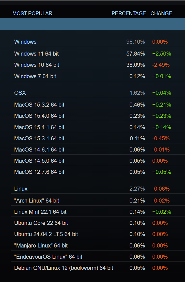 Concernant le classement des systèmes d’exploitation, il semble que la date de fin de support prévue pour Windows 10, le 11 novembre, ait un impact significatif. Les participants à l’enquête ont longtemps conservé l’ancienne version de l’OS, mais sa base d’utilisateurs continue de diminuer chaque mois tandis que les chiffres de Windows 11 augmentent. La version plus ancienne détient désormais 38% de part de marché, tandis que la plus récente approche les 58%.