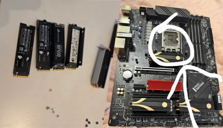 L’utilisateur u/R550MAGIC2 raconte avoir profité de sa chance en découvrant des composants coûteux lors de l’achat d’une carte mère d’occasion. Il a trouvé une carte mère MSI PRO Z690-A WiFi à seulement 50 € sur le marché, et a remarqué plusieurs refroidisseurs M.2 installés.