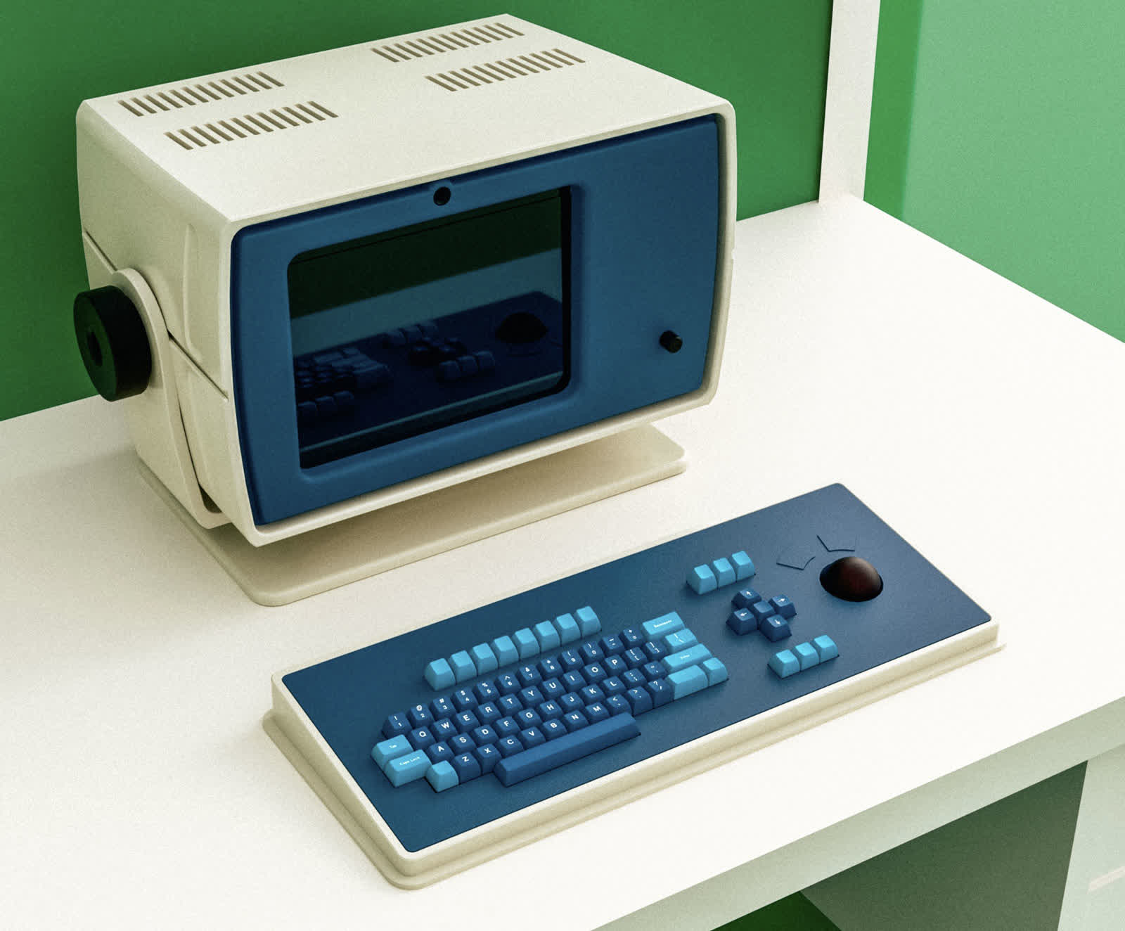 Le clavier présente un profil surélevé, des bords épais et une palette de bleus atténués avec un cadre blanc sale, lui conférant une ambiance industrielle. Des touches bleu clair dominent le centre, tandis que des teintes plus foncées complètent le reste. Ce « reste » est conséquent, grâce au deck surdimensionné, qui laisse amplement d’espace pour les touches fléchées, disposées en croix et séparées du groupe principal. À droite se trouve une boule de suivi – comme dans la série – remplaçant une souris traditionnelle et ajoutant au charme vintage.