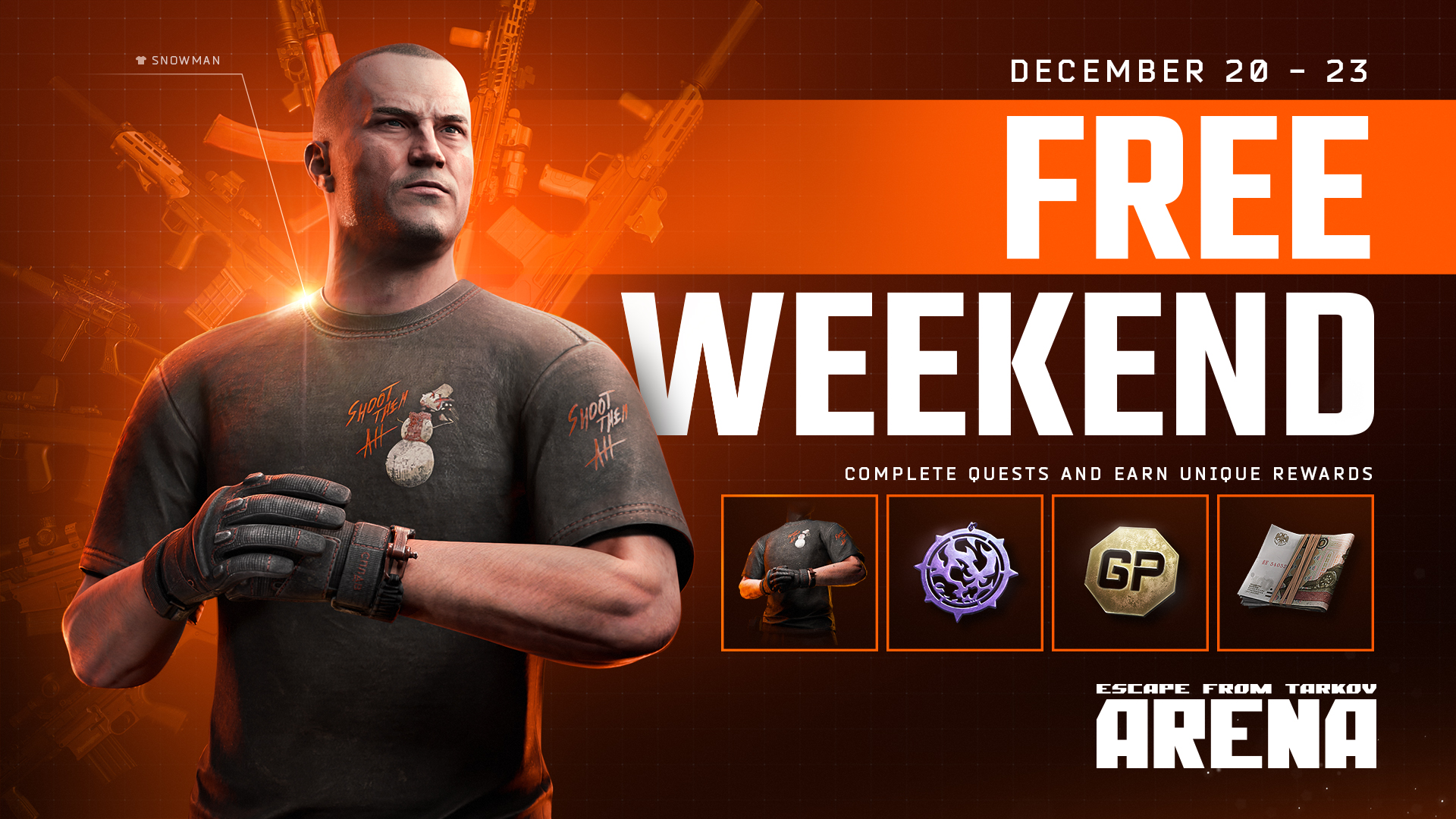 Pour célébrer ce week-end, tous les participants recevront un t-shirt unique en forme de bonhomme de neige en terminant une quête spéciale. Peu importe si vous décidez d’acheter le jeu après cet événement : cet objet restera dans votre compte de manière permanente, même si vous n’accédez plus à Escape from Tarkov.