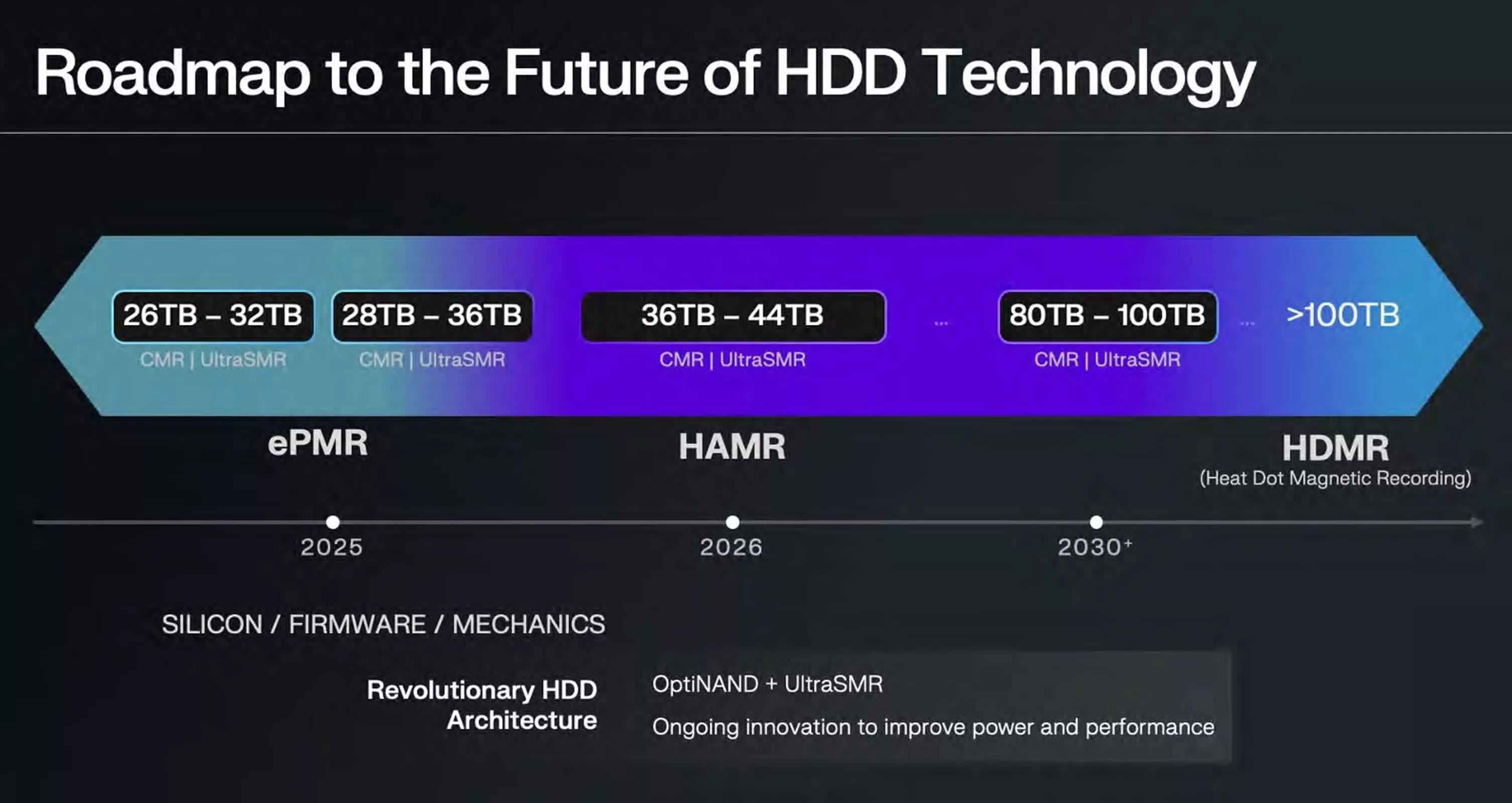 Western Digital prévoit de lancer ses premiers HDD basés sur HAMR en 2026, avec des capacités initiales de 36 To pour l’enregistrement magnétique conventionnel (CMR) et 44 To pour l’enregistrement UltraSMR en couches. La société teste déjà des disques durs HAMR avec deux grands clients hyperscale. D’ici 2030, Western Digital vise à développer des HDD avec des capacités allant de 80 To à 100 To en utilisant la technologie HAMR.