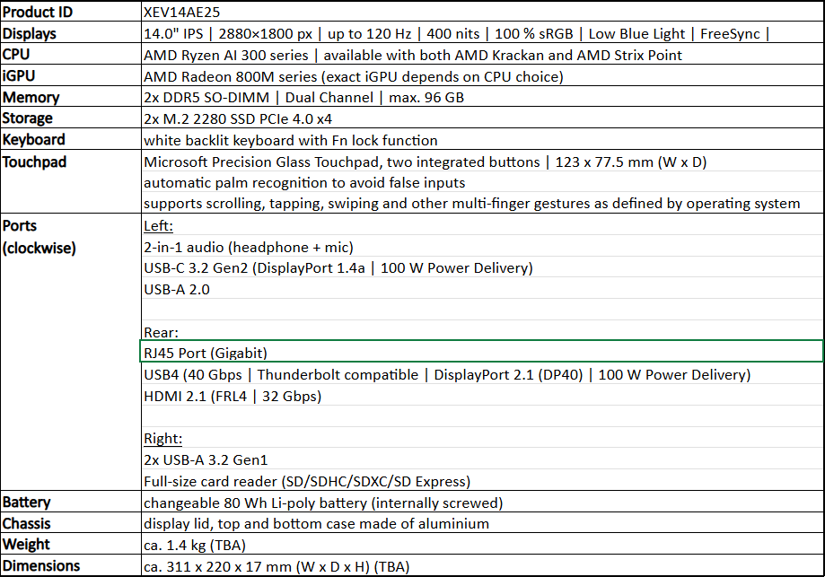 XMG a également annoncé des mises à jour pour les modèles EVO 14 et 15, qui continuent de séduire grâce à leur conception robuste et légère, ainsi qu’à leurs options de connectivité avancées. Quoique le design et les caractéristiques principales restent inchangés, les performances de processeur sont désormais renforcées par les Ryzen AI 300 d’AMD.
