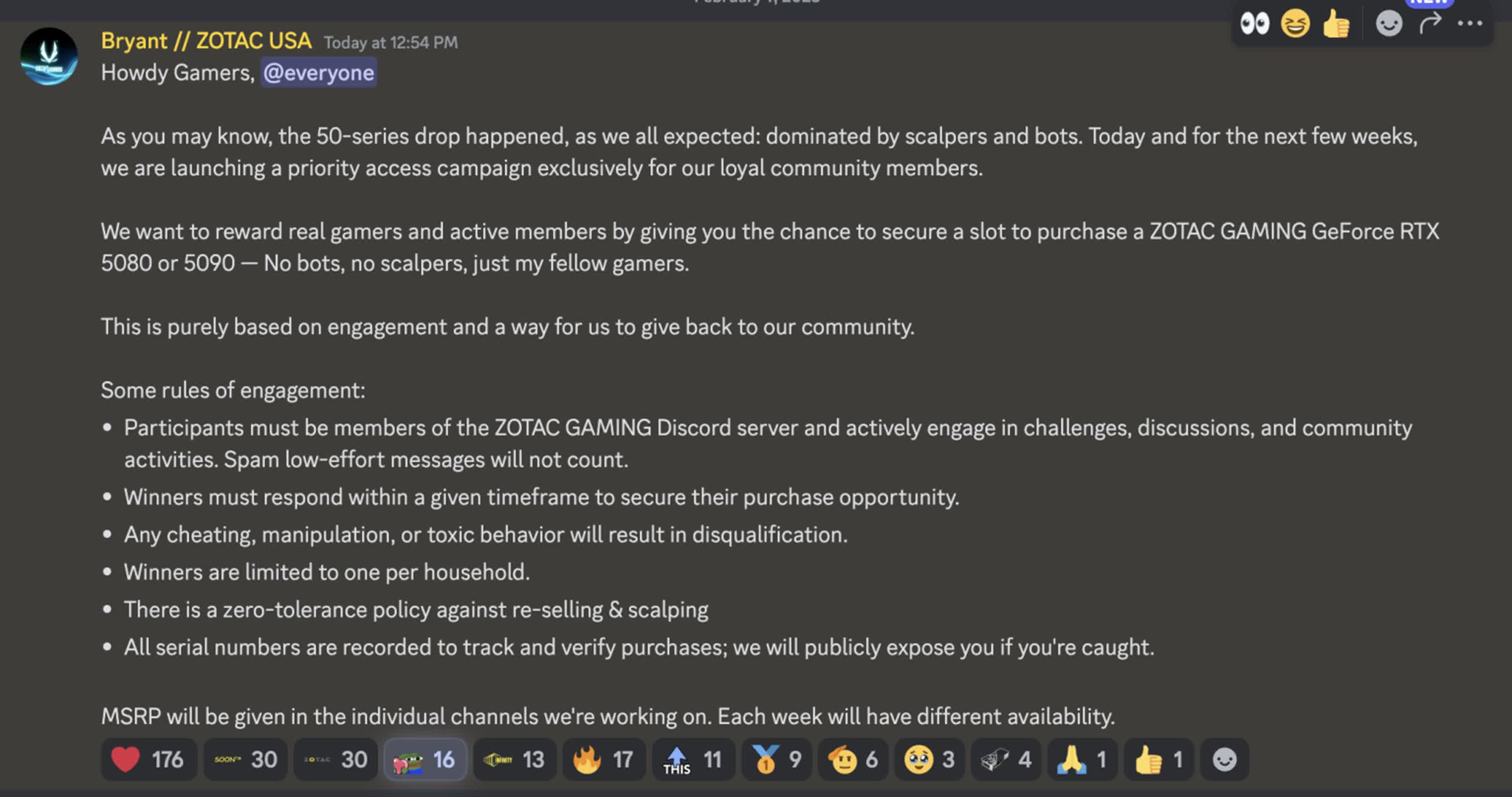 Zotac vise à contourner ces problèmes en priorisant les membres actifs de sa communauté en ligne. Un employé de Zotac, connu sous le nom de Bryant, a annoncé la campagne sur le serveur Discord de l’entreprise, soulignant l’engagement de la société à récompenser les « vrais joueurs » plutôt que les bots ou les scalpers.